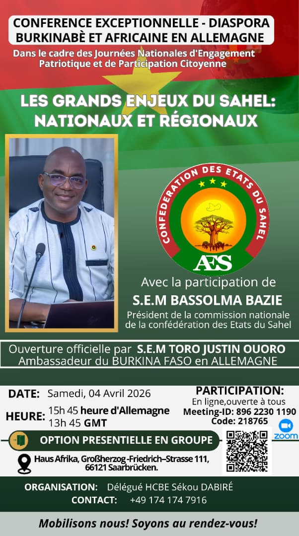 Sonderveranstaltung – Die großen Herausforderungen der Sahelzone: nationale und regionale Im Rahmen der Nationalen Tage des patriotischen Engagements hält S.E. Bassolma Bazié, Präsident der Nationalen Kommission der Konföderation der Sahelstaaten (AES), einen Vortrag, der sich an die burkinische und afrikanische Diaspora sowie an alle Interessierten richtet. Samstag, 4. April 2026 um … Weiterlesen